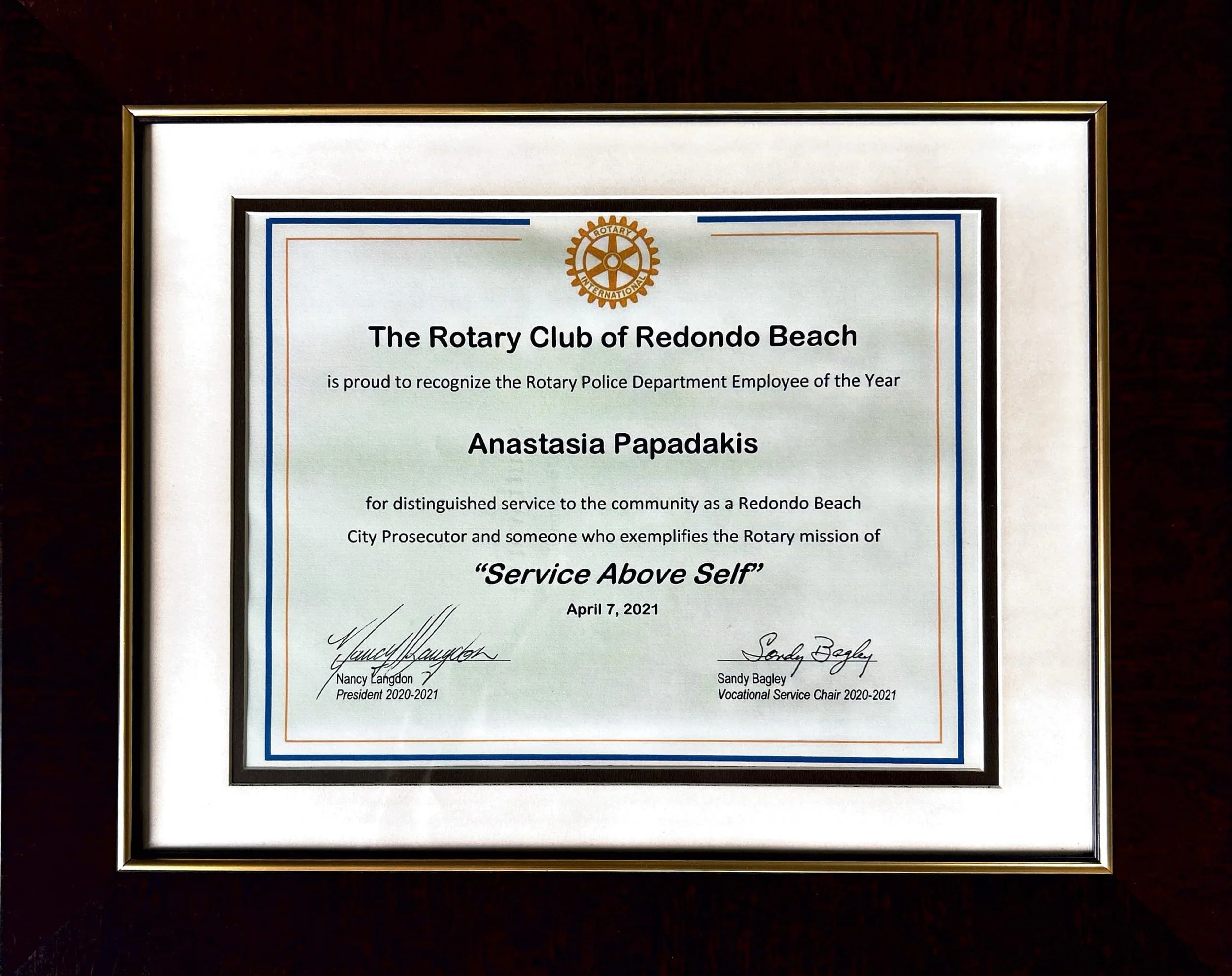 Awarded “Service Above Self” for my outstanding work with the City of Redondo Beach