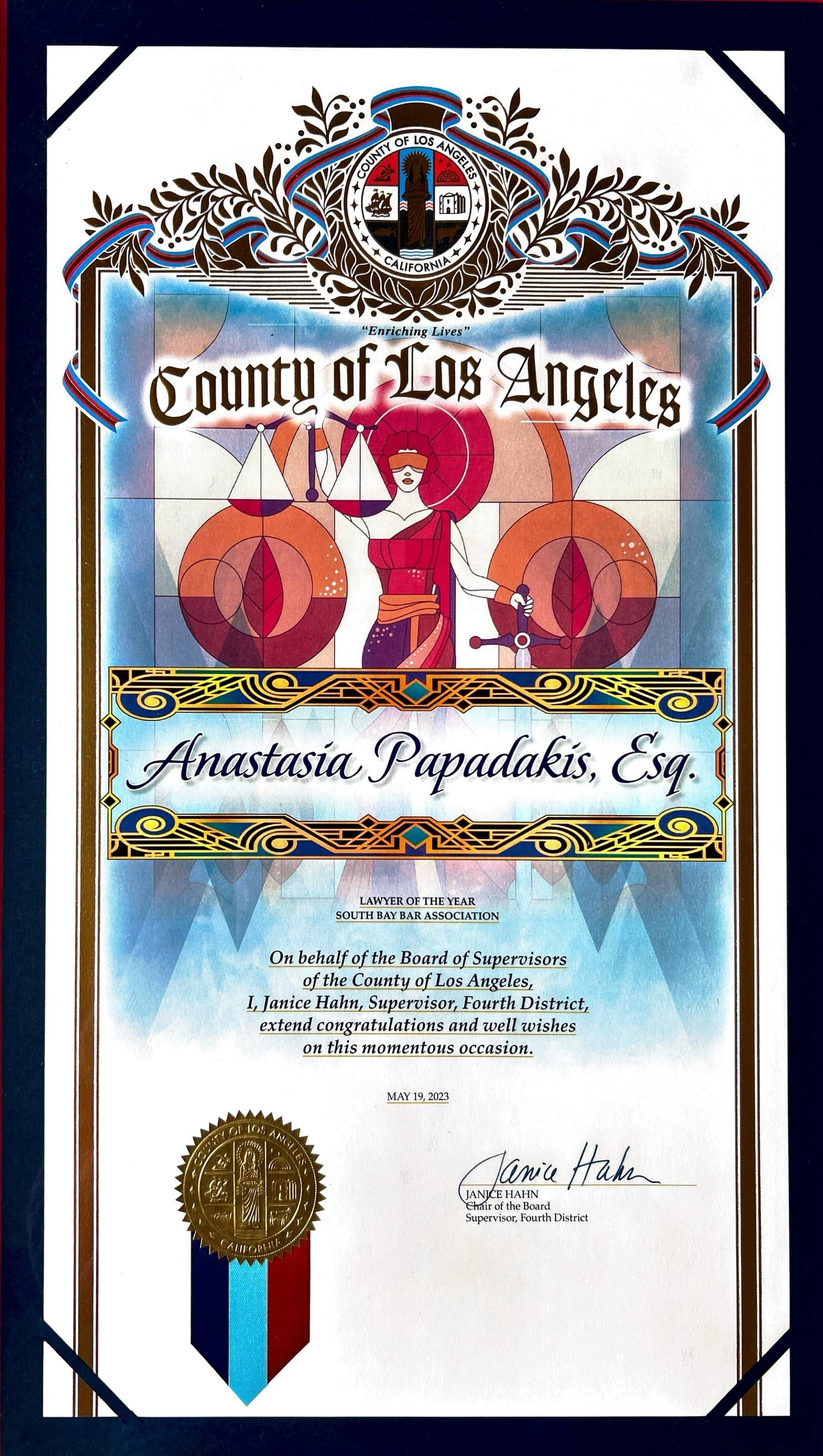 Janice Hahn, Supervisor of the Fourth District, Recognition of Service for my work with the City of Redondo Beach Housing Initiative Court.