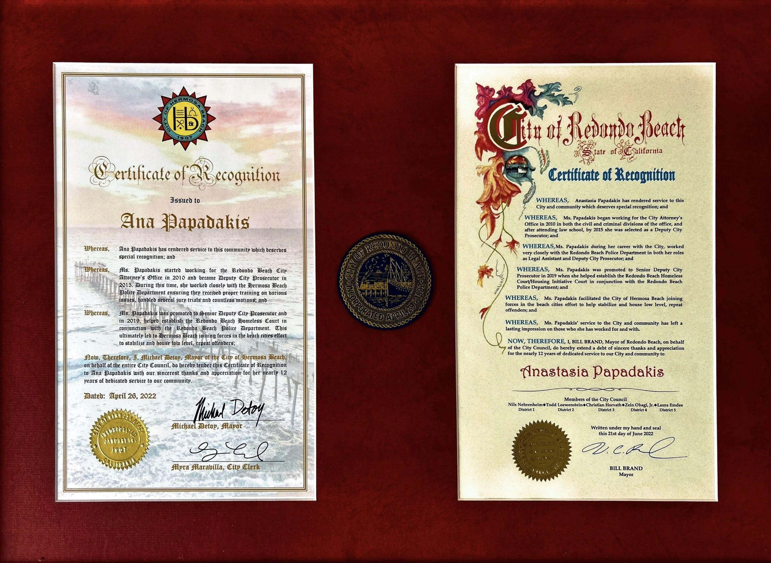 City of Redondo Beach and City of Hermosa Beach Mayor and Council issued Certifications of Recognition for my service to each City.